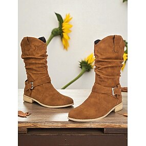 stivali da donna in pelle scamosciata marrone a metà polpaccio – stivaletti in stile western con cinturino con fibbia e tacco basso a blocco, scarpe retrò autunnali per streetwear, outfit casual e look ispirati al rodeo