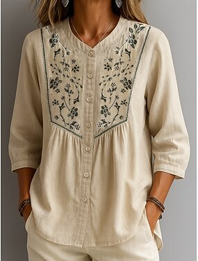 Per donna Camicie di cotone e lino Floreale Bohemien Casual Manica 3/4 Girocollo Top Regolari Quotidiano Ricamato Verde Albicocca Estate Primavera Autunno