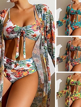 Costume da bagno bikini da donna in 3 pezzi vita alta slim estate in spiaggia foglie floreali scollo a V senza maniche