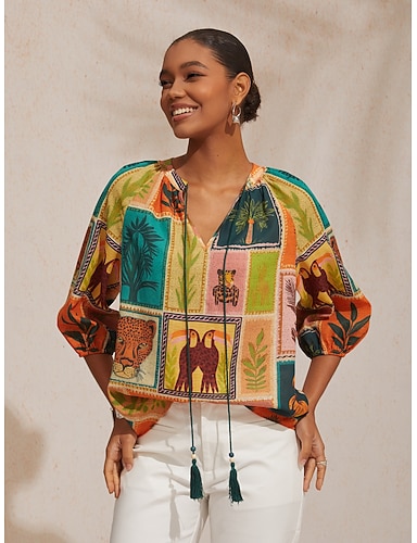 Per donna Femminile Camicia casual Floreale Casuale Corte Giallo Floreale Manica 3/4 Vacanza Scollo a V