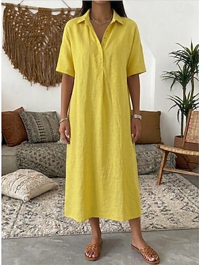 Per donna Abito Midi Finto cotone e lino Abito a Tubino Casual Quotidiano Vestibilità comoda Semplice Mezza Manica Bavero Giallo Rosso Viola Verde Estate Primavera Autunno