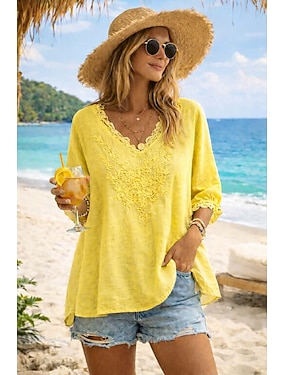 Per donna Camicie di cotone e lino Blusa Finto cotone e lino Bottoni Orlo asimmetrico Semplice Attivo Elegante Manica 3/4 Manica a Campana Scollo a V Top Regolari Quotidiano Ferie Uscire Blu Giallo