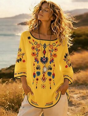 Blusa Boho da donna simile al lino traspirante leggera grafica floreale elegante bohemia vintage maniche lunghe scollo a V top regolari quotidiano festa patchwork bottoni stampa giallo verde estate