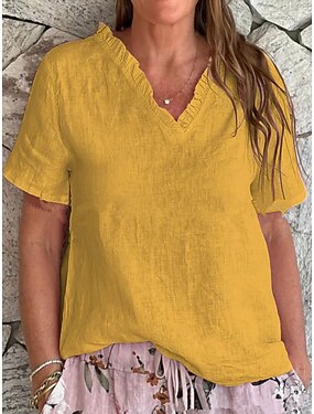 Per donna Blusa Finto cotone e lino Volant Tinta unica Elegante Casual Manica Corta Scollo a V Top Regolari Quotidiano Ferie Blu Nero Bianco Giallo Rosa Estate