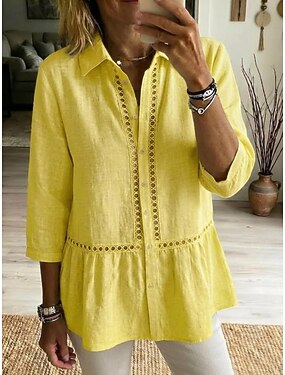 Per donna Blusa Finto cotone e lino Ricamato Bottoni Tinta unica Elegante Casual Manica 3/4 Girocollo Top Regolari Quotidiano Bianco Giallo Rosa Viola Arancione Estate Primavera Autunno