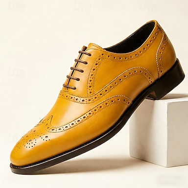 Scarpe Oxford brogue da uomo color giallo senape con punta a coda di rondine e dettagli traforati, classiche scarpe eleganti vintage da uomo, ideali per matrimoni, riunioni di lavoro, feste e occasioni formali.