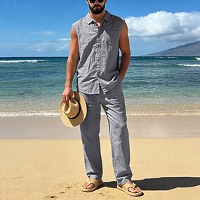 Per maschio Camicia di lino Due pezzi Set Camicia E Pantaloni di Lino Pantaloni Pantaloni casual Impostare Semplice Quotidiano All'aperto Vacanza Collo ripiegato Senza Maniche Estate Moda Casual