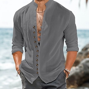 Per uomo camicia di lino Maglietta informale Camicia da spiaggia Liscio Hawaiano Per eventi Grigio Manica lunga Henley Primavera estate Abbigliamento
