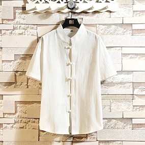 Per uomo Camicia in cotone e lino Semplice Vacanza Bianco Manica Corta Colletto alla coreana Estate Abbigliamento