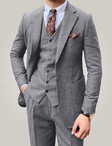 Uomo Completi in Tweed Matrimonio Ricevimento di matrimonio Marrone Grigio chiaro Autunno Tuta Bavero classico Retrò Vintage Formale Spina di Pesce Vestibilità standard 3 pezzi Monopetto Due Bottoni