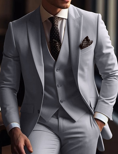 Uomo Completi Affari Matrimonio Grigio chiaro Primavera, Autunno, Inverno, Estate Tuta Moda Formale Tinta unita Vestibilità aderente 3 pezzi Monopetto Due Bottoni