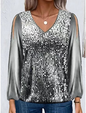Blusa Donna Colore Solido Giornaliero Stilosa Casual Manica Lunga Collo a V Regolare Top Giornaliero Paillettes Patchwork Vino Verde Grigio Primavera Autunno Inverno