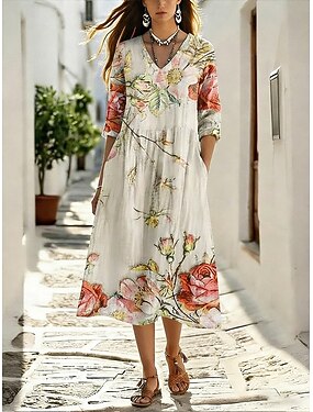 Per donna Abito maxi Finto cotone e lino Abito a Tubino Casual Quotidiano Vestibilità regolare Floreale Manica 3/4 Scollo a V Giallo Verde Grigio Primavera Autunno