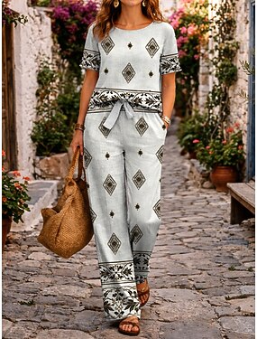 Per donna Set di biancheria in cotone Manica Corta Girocollo Grafico Geometrico Elegante Bohemien Quotidiano Casuale Quotidiano Vacanza Blu Bianco Rosa Estate Vestibilità regolare