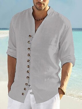 Per uomo camicia di lino Camicia con colletto a fascia Camicia estiva Abbigliamento mare Tinta unica Giornaliero Hawaiano Nero Bianco Vino Blu marino Manica lunga Henley Primavera & Autunno