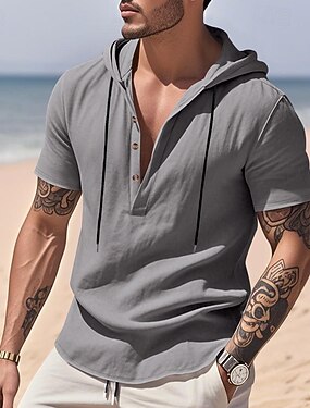 Per uomo Camicia Camicia di lino Camicia casual Camicia con Bottoni Tinta unica Vacanza Streetwear Nero Bianco Blu marino Marrone Manica Corta Con Cappuccio Estate Abbigliamento Cappuccio regolabile