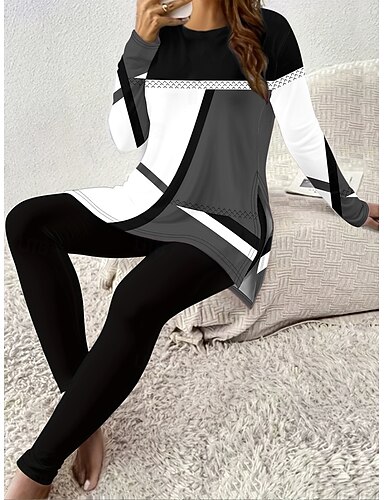 Per donna Elegante Vacanza Moda Maglietta Set di Pantaloni Manica Lunga Girocollo Grafico Geometrico A righe Stampato Casuale Quotidiano Casual Quotidiano Borgogna Verde Grigio scuro Primavera