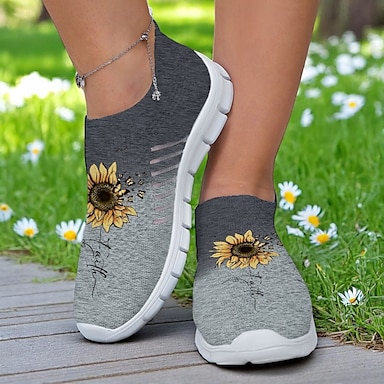 Sneakers slip-on da donna in maglia grigia con stampa di girasoli – scarpe casual leggere da passeggio per viaggi, uso quotidiano e gite primaverili