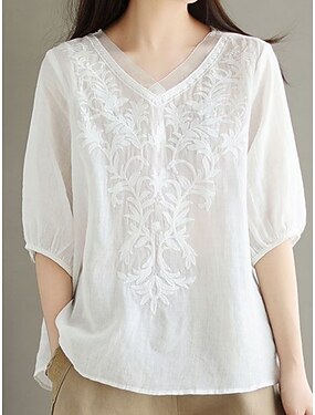 Camicia da donna in cotone e lino, floreale, basic, etnica, casual, manica a 3/4, scollo a V, normale, top, quotidiano, ricamato, giallo, blu navy, viola, arancione, albicocca, estate