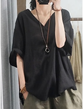 Per donna Blusa Finto cotone e lino Tinta unica Elegante Casual Manica 3/4 Scollo a V Top Regolari Quotidiano Nero Bianco Rosa Verde Albicocca Estate Primavera