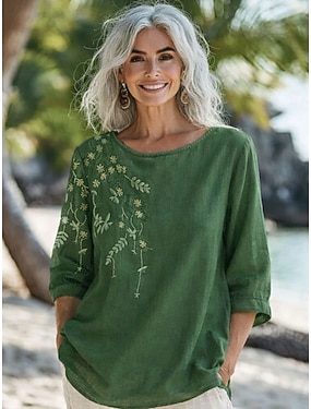 Per donna Blusa Camicia in finto lino Ricamato Bottoni Floreale Elegante Casual Manica 3/4 Girocollo Top Regolari Quotidiano Giallo Viola Verde Grigio Estate Primavera Autunno