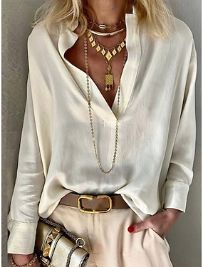Per donna Camicia Blusa Finto cotone e lino Tinta unica Essenziale Casual Manica 3/4 Dolcevita Top Regolari Quotidiano Bianco Vino Cachi Autunno
