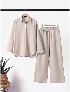 Per donna Set di Pantaloni Finto cotone e lino Manica Lunga Colletto a Camicia Tinta unica Elegante Moda Streetwear Casuale Quotidiano All'aperto Verde militare Blu marino scuro Cachi Estate