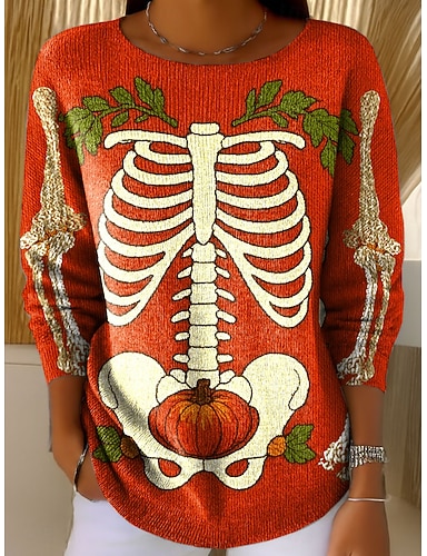 Maglione da donna Scheletro Carino Streetwear Casual Grafica Scheletro Girocollo Patchwork A Maglia Manica Lunga Regolari Tops MagliaArancione Autunno Inverno