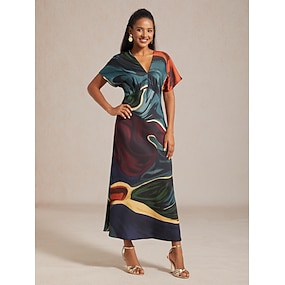 abito lungo da donna in raso con stampa astratta, manica a dolman, scollo a V, cintura, elegante, casual, vacanza, primavera estate autunno
