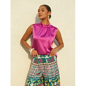 top casual da vacanza in raso con collo alto e maniche larghe