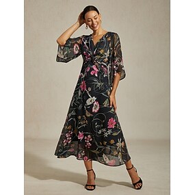 Per donna Abito Etnico Abito Largo Abito lungo maxi Rosa Manica 3/4 Stampa Floreale marocchino Oversize Stampa Primavera & Autunno Interstagionale colletto dentellato Casual Traspirante Larghi XS S M