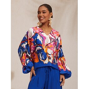 Per donna Femminile Camicia button-down Camicia casual Floreale Casuale A sbuffo Marrone Manica Lunga Elegante Bohemien Vacanza Collo Alto Estate Primavera