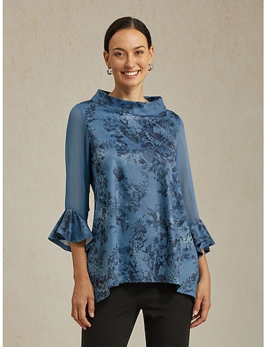 camicetta da donna grigio blu floreale collo alto maniche trasparenti orlo asimmetrico vestibilità comoda casual vacanza primavera estate autunno