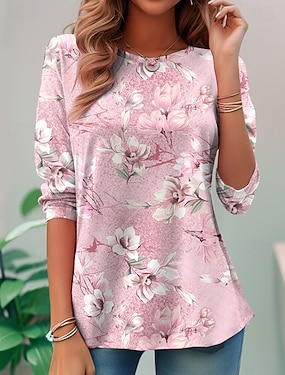 T shirt da donna a maniche lunghe con scollatura a girocollo tunica lunga stampa 3D floreale elegante vintage top regolari quotidiani uscita weekend stampa perla precaldo