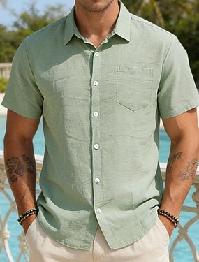 Per uomo Camicia Camicia di lino Camicia con Bottoni Tinta unica All'aperto Vacanza Nero Bianco Verde chiaro Verde scuro Manica Corta Colletto a Camicia Estate Primavera Abbigliamento Tasca