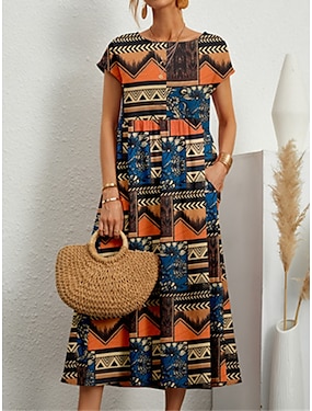 Per donna Abito Midi Finto cotone e lino Abito a Tubino Vestito Casual Moda Stile Etnico Casual Quotidiano All'aperto Vacanza Vestibilità comoda Geometrico Fiore Manica Corta Girocollo Nero Giallo