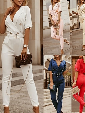 Per donna Normale Tuta Elegante Tinta unica Manica corta A V Vita alta Con Treno Ufficio Standard Blu marino Estate