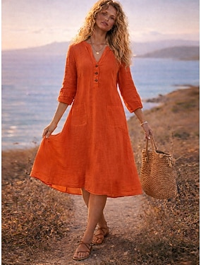 Per donna Abito Midi Finto cotone e lino Abito Camicia Vestito Casual Classico Moderno All'aperto Vacanza Ferie Vestibilità regolare Semplice Manica Lunga Scollo a V Nero Viola Arancione Azzurro