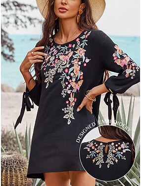 Per donna Mini Abito Abito nero Abito da Cocktail Abito Formale Abito messicano Classico Boho Quotidiano Vestibilità comoda Floreale Manica Lunga Girocollo Nero Estate Primavera