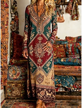 Per donna Abito maxi Abito Boho Abito Vintage Vestito Casual Vintage Quotidiano All'aperto Vacanza Vestibilità comoda Geometrico Manica Lunga Scollo a V Blu Viola Fucsia Verde Primavera Autunno