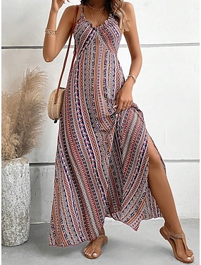 Per donna Abito Midi Abito Boho Vestito Casual Tubino Elegante Moda Moderno All'aperto Spiaggia Vacanza Vestibilità regolare Grafico A righe Senza Maniche Scollo a V Blu Vino Rosso Verde Estate