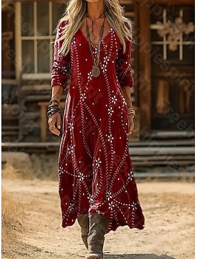 Per donna Vestito maxi Abito casual Vestito svasato Abito linea A Abito boho Boemia Vintage Informale Giornaliero Standard Color Block Manica lunga A V Rosso Estate Primavera Autunno