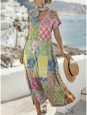 Per donna Abito maxi Abito Boho Abito Vintage Vestito Casual Elegante Moda Moderno All'aperto Spiaggia Vacanza Vestibilità regolare Grafico Manica Corta Scollo a V Nero Giallo Blu marino Verde Estate