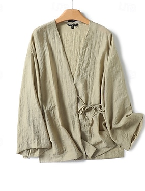 Per donna Camicie di cotone e lino Blusa Nodo frontale Semplice Elegante Vintage Manica Lunga Scollo a V Top Regolari Quotidiano Ferie Uscire Verde Estate Primavera