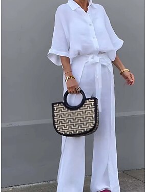 Per donna Camicia Set di biancheria in cotone Set da due pezzi Pantaloni a Gamba Larga Manica 3/4 Colletto a Camicia Semplice Quotidiano Essenziale Casuale Quotidiano Blu Bianco Giallo Primavera