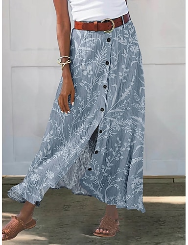 Gonna maxi da donna in lino simile Vita media Gonne Floreale Floreale Inelastica Quotidiana Vacanza Marrone Blu scuro Bianco+Blu Beige Estate Poliestere