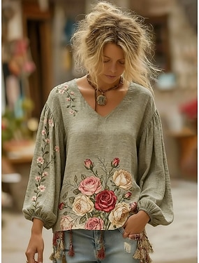 Per donna Camicia Camicia Boho Finto cotone e lino Stampato Floreale Grafico Bohemien Vintage Classico Manica Lunga Scollo a V Top Regolari Quotidiano Ferie Uscire Verde Estate Primavera Autunno