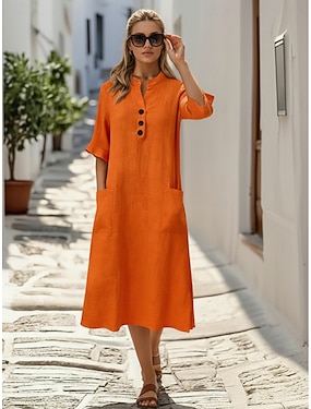 Per donna Abito Midi Finto cotone e lino Abito a Tubino Casual Quotidiano Vestibilità comoda Semplice Manica 3/4 Scollo a V Arancione Estate Primavera Autunno
