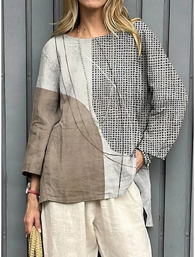 Blusa da donna in lino simile traspirante leggera geometrica vintage stilosa maniche lunghe scollo rotondo lunghi abituali khaki estate primavera
