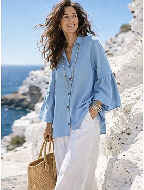 Per donna Blusa Finto cotone e lino Volant Tinta unica Elegante Casual Manica Lunga Scollo a V Top Regolari Quotidiano Blu Bianco Giallo Rosa Estate Primavera Autunno
